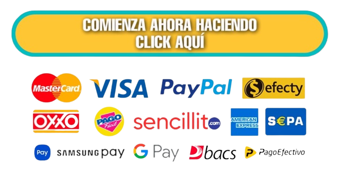 Puedes pagar con tarjeta de crédito, débito, PayPal desde cualquier país del mundo.