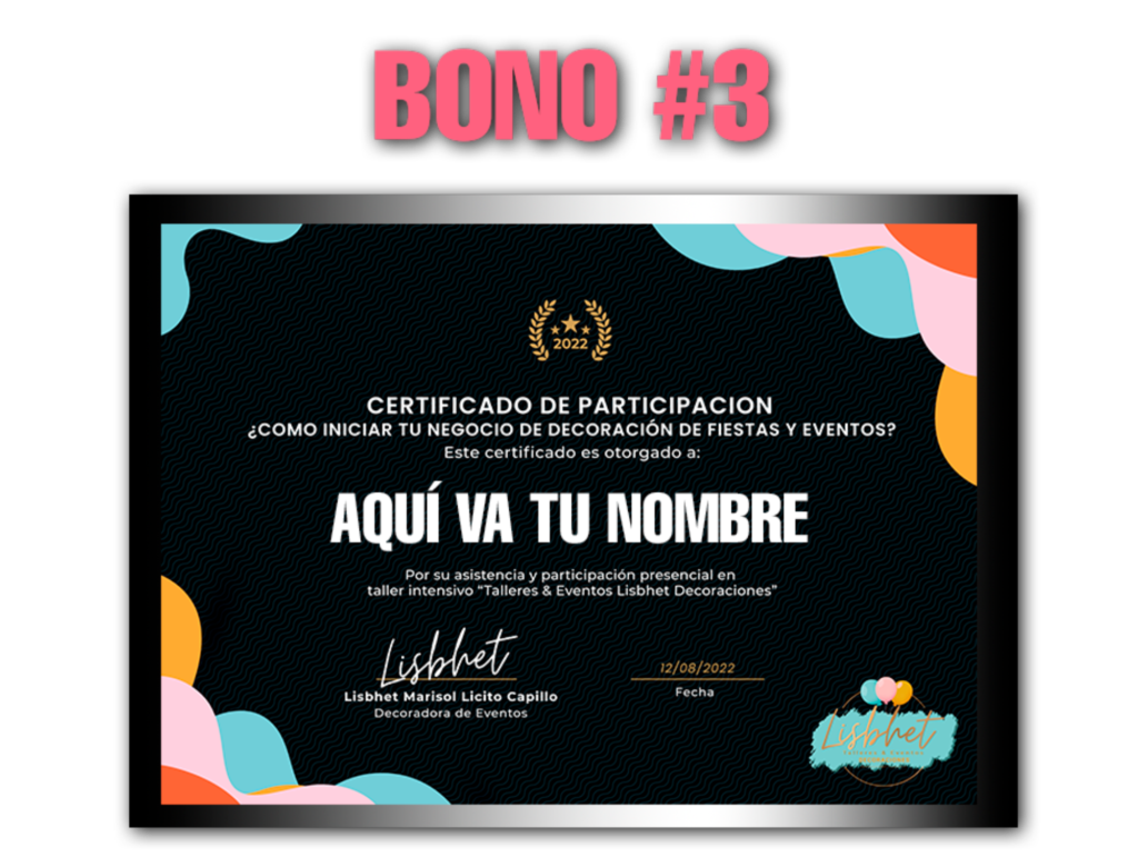 Certificado Internacional que te Califica como DECORADORA PROFESIONAL de Eventos con Globos.